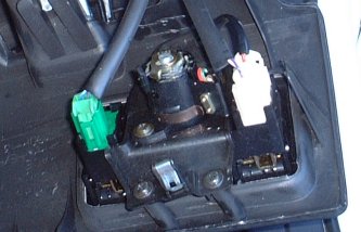 | ←純正の裏側。緑がフェールボタン。イルミ電源が純正でないため、他から電源を取らなくてはなりません。電源はミラー開閉のイルミ電源から割り込んで取りました。ここから取ると、ライトON,OFFで夜間のみの点灯になります。 | ||||||||||||